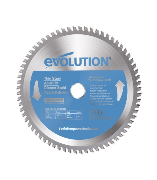 Piła widiowa Evolution Power Tools z uzębieniem z węglika spiekanego przeznaczona do cięcia cienkiej stali 185mm / 68z - w tej wersji przeznaczona do pilarek Evolution..Wysokiej jakości piła tarczowa z uzębieniem z węglika spiekanego firmy Evolution Power Tools. Przeznaczona do cięcia profili stalowych, płaskowników i blach wykonanych ze stali konstrukcyjnych.Przystosowana do cięcia cienkiej stali.Zastosowanie pił widiowych Evolution Power Tools zapewnia uzyskanie wysokiej wydajności. Uzyskano to poprzez użycie do produkcji materiałów najwyższej jakości, w tym najlepszego gatunku węglika spiekanego, specjalnie hartowanego korpusu tarczy i unikalnej, najnowszej technologicznie technologii lutowania węglików spiekanych.Tarcze produkowane są w Japonii w jednej z najnowocześniejszych fabryk, co gwarantuje ich wysoką jakość i trwałość.Piła widiowa może zostać poddana ostrzeniu ZESTAW ZAWIERA: 1 x Piła widiowa Evolution TCT do cięcia cienkiej stali 185mm / 68z do pilarek.
