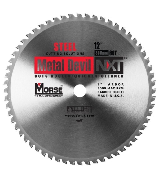 Wydajna piła tarczowa z uzębieniem węglika spiekanego MK MORSE Metal Devil NXT.Tarcza przeznaczona do cięcia stali na przecinarkach o maksymalnych obrotach nie przekraczających 2000 obr./minZalecana przecinarka: Makita LC1230Technologia NXT od MK MORSE - zalety i korzyści:- stabilny proces cięcia,- łatwiejsze cięcie i dłuższa żywotność tarczy.Unikalny kształt zęba dopasowany do zastosowania - zalety i korzyści::- minimalizacja zużycia uzębienia podczas cięcia,- wydłużona żywotność tarczy.Wysokiej jakości węglik spiekany - zalety i korzyści:- zwiększona wytrzymałość tarczy,- zmniejszenie kosztu jednostkowego cięcia.Piły tarczowe Metal Devil® NXT do cięcia stali oraz innych metali z łatwością zastępują tradycyjne tarcze poszerzając zakres ich zastosowań. Tarcze Metal Devil® NXT pozwalają ciąć szybciej, bez nagrzewania materiału, przypaleń oraz dłużej niż zwykle tarcze do stali.Cięcie na zimno.Podczas pokazów tarcz Metal Devil® NXT, prosimy zainteresowanych o dotknięcie przeciętej powierzchni. Są zdumieni faktem, że powierzchnia jest zimna. Specjalne zęby z węglikiem spiekanym redukują przenoszenie ciepła na materiał do minimum. Podczas cięcia praktycznie nie występują iskry.Szybsze cięcie.Tarcze Metal Devil® NXT pozwalają na cięcie o wiele szybsze niż w przypadku użycia tradycyjnych tarcz. Teraz możesz pracować lepiej i o wiele szybciej. Używanie tarcz Metal Devil® NXT zapewnia niski koszt jednostkowego cięcia.Dłuższe cięcie.Ośrodki tarcz Metal Devil® NXT wykonano ze specjalnego gatunku stali narzędziowej. Węgliki dobrane zostały w sposób optymalizujący zużycie i wytrzymałość ostrzy. Konstrukcja tarczy eliminuje do minimum drgania, co wpływa na wydłużenie jej żywotności.Z tarczami Metal Devil® NXT przetniesz więcej, szybciej i taniej niż innymi tarczami.Uwaga:Bezwzględnie należy przestrzegać maksymalnej dopuszczalnej ilości obrotów dla każdej tarczy.