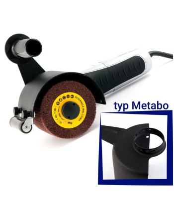 System mocowania METABO. Przystawka do satynowania, szlifowania, matowienia i polerowania powierzchni płaskich. Rolka prowadząca umożliwia precyzyjne szlifowanie oraz równomierne zużycie narzędzi ściernych.Odpowiednią powierzchnię uzyskujemy korzystając z odpowiednich granulacji płótna ściernego, włókniny szlifierskiej i polerskiej. Można stosować ściernice listkowe walcowe, szczotki do postarzania drewna, oponkę z pasami bezkońcowymi.Do przystawki dokupić można również specjalną oponę, na którą mocowane mogą być pasy bezkońcowe umożliwiające obróbkę stali i stali nierdzewnej.Przystawka kompatybilna ze szlifierkami kątowymi:Metabo WE 14-125 VSMetabo WE 9-125 QuickMetabo WEV 10-125 QuickMetabo WEV 15-125 QuickZESTAW ZAWIERA: 1 x rolka prowadząca1 x trzpień mocujący ściernicę,1 x specjalistyczna osłona ściernicy,1 x ściernica listkowa walcowa 100x100x19mm, z włókniny szlifierskiej,1 x ściernica listkowa walcowa 100x100x19mm, z płótna ściernego,1 x instrukcja obsługi,1 x gwarancja producenta (12 miesięcy)