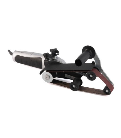 Przystawka do szlifowania i polerowania elementów owalnych (rur, poręczy itp.) jest doskonałym narzędziem dla wymagających użytkowników.Dzięki standardowemu mocowaniu na gwincie M14 przystawkę można zamontować do każdej szlifierki kątowej 125mm wyposażonej w system płynnej regulacji prędkości, bez ingerencji w konstrukcję szlifierki.Bardzo precyzyjne prowadzenie urządzenia dzięki ruchomej dźwigni, która umożliwia regulację docisku pasa do szlifowanej powierzchni.Praca z wykorzystaniem przystawki jest wygodna i ergonomiczna dla operatora, umożliwia trzymanie zestawu w obu rękach.Specjalistyczna, regulowana osłona zabezpiecza przed pyłem i wiórami. RolkiWszystkie 4 rolki są ułożyskowane. Rolka napędowa posiada okładzinę z poliuretanu zapewniającej bardzo dobrą przyczepność do pasa. Dzięki zastosowaniu odpowiedniej chropowatości okładziny zjawisko poślizgu jest zminimalizowane. 2 rolki prowadzące wykonane są z poliamidu i posiadają ranty, które zabezpieczają pas bezkońcowy przed zsunięciem. Dodatkowa rolka bez rantów umożliwia szlifowanie doczołowe.Pasy bezkońcoweDzięki zastosowaniu rantów można użytkować pasy wykonane na sztywnych podłożach oraz włókniny szlifierskie i polerskie.Zalecane szerokości pasów to 30mm i 35mm.Stopka (opcja)Istnieje także możliwość użycia stalowej stopki podklejonej grafitem. Po wymontowaniu jednej z rolek prowadzących umieszczamy w to miejsce stopkę. Zastosowanie stopki umożliwia szlifowanie powierzchni płaskich.Części zamienneZapewniamy wszystkie części użytkowe, wykaz dostępny poniżej w osprzęcie.Projekt uwzględniający sugestie użytkowników, wysoka jakość wykonania oraz solidna stalowa konstrukcja malowana proszkowo wyróżniają nasz produkt na tle innych rozwiązań.Szczegółowa instrukcja obsługi i filmy instruktażowe sprawiają, że montaż całego zestawu jest niezwykle prosty i szybki. Duży wybór materiałów ściernych i polerskich zapewnia, że uzyskamy żądaną jakość powierzchni przy minimalnym nakładzie pracy.ZESTAW ZAWIERA: 1 x przystawka do szlifowania GLOB SYSTEM GS09-00,1 x pas bezkońcowy z płótna ściernego 35x650 mm,1 x instrukcja obsługi,1 x opakowanie: karton GLOB SYSTEM,1 x gwarancja producenta (12 miesięcy)