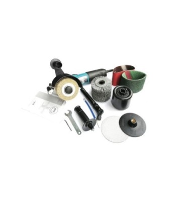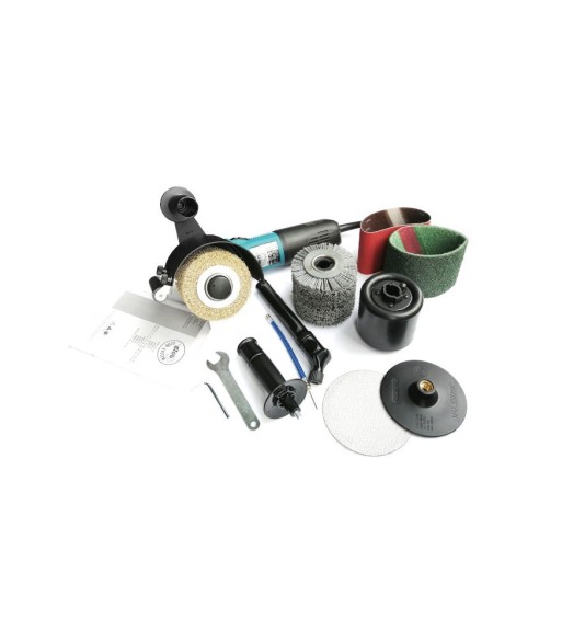 1 x Szczotka do postarzania drewna z drutu mosiądzowanego,1 x Szczotka do postarzania drewna z nylonu,1 x Szlifierka kątowa Makita SA 5040C,1 x osłona szlifierki przystosowana do pracy ze szczotkami do postarzania drewna,1 x Rolka prowadząca (podporowa),1 x Trzpień do zamontowania szczotek do postarzania drewna,1 x opona szlifierska,1 x pompka do oponki,1 x dysk szlifierski na rzep firmy Makita (gwint M14)1 x papier ścierny 125mm,1 x pas bezkońcowy z płótna 100x292mm,1 x pas bezkońcowy z włókniny 100x292mm,1 x walizka transportowa.